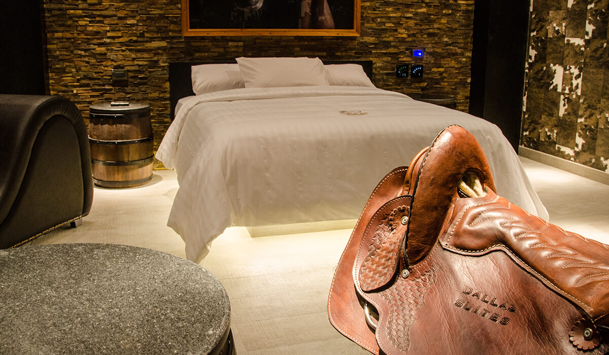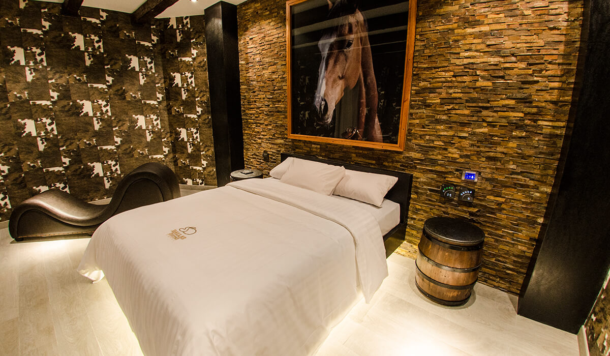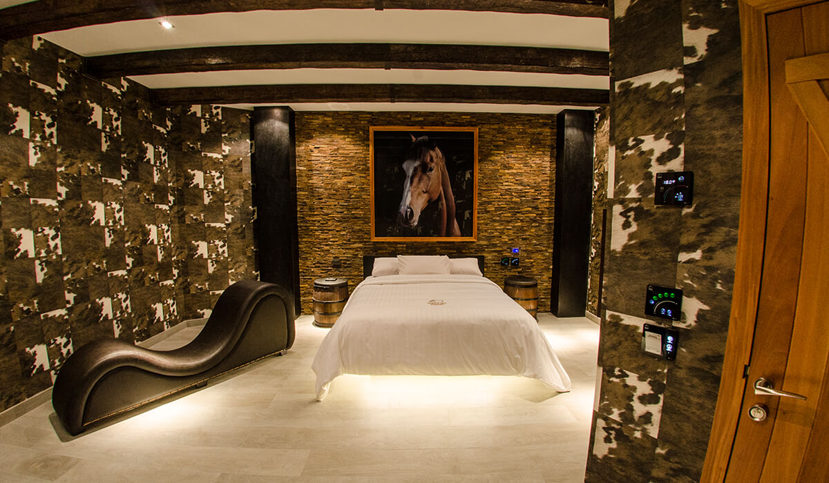 Recreando la naturaleza pero con la vanguardia de la arquitectura moderna, ofrecemos una suite ambientada en una caballeriza. Con paredes texturizadas, sillas de montar, barriles de madera y un sublime mueble tantra de cuero negro donde podrá experimentar nuevas formas de relajarse.