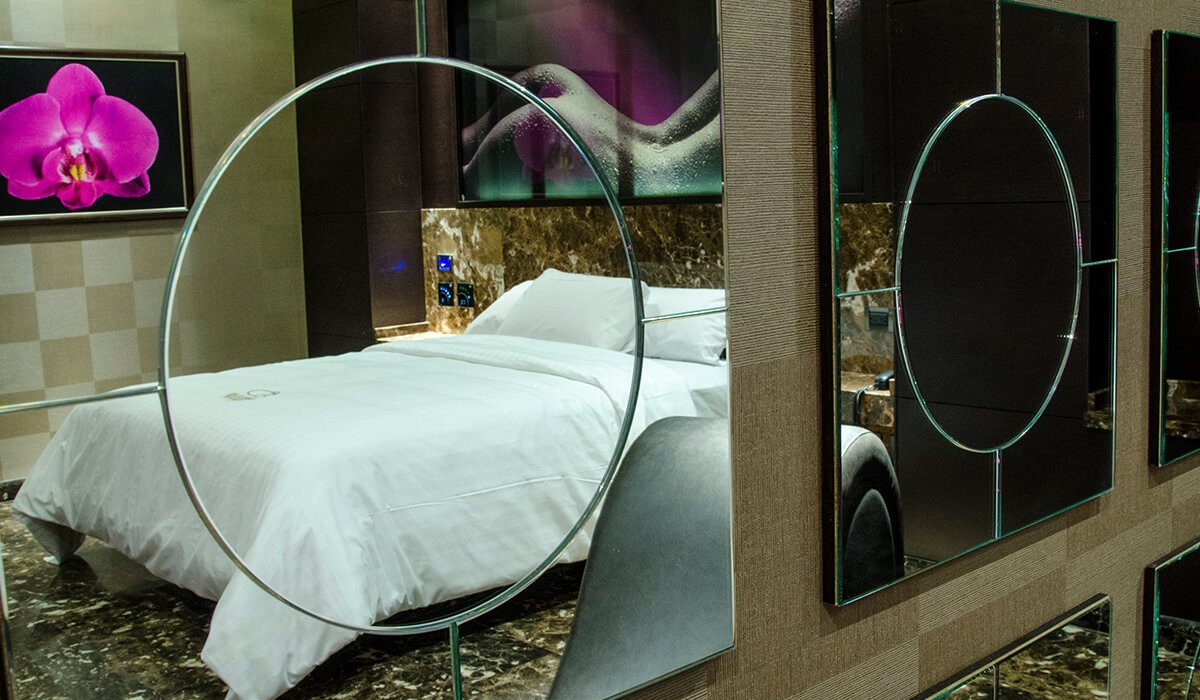 Chic y moderna suite para tener una verdadera experiencia VIP. Con los controladores touch adaptará la temperatura, la iluminación, la televisión y un dispositivo de audio totalmente a su gusto. Como si fuese poco, tiene un mueble tantra de cuero negro y un exclusivo espejo negro.